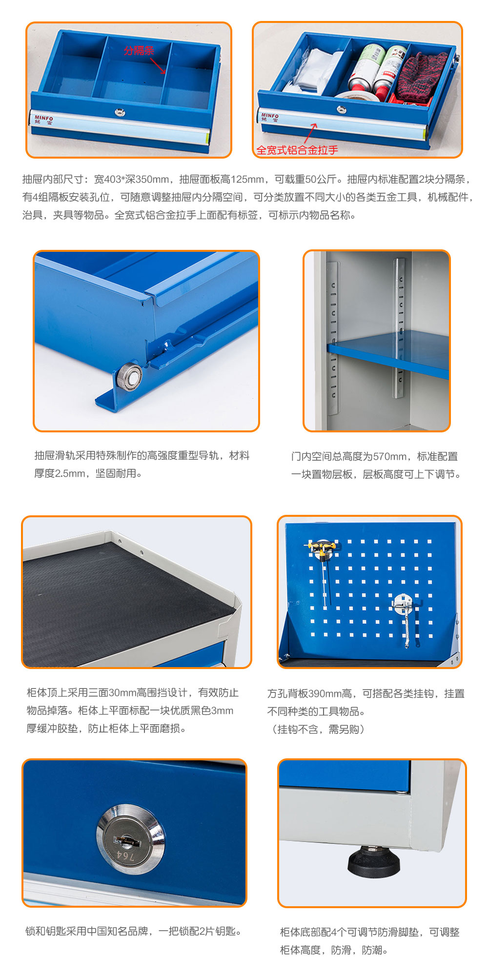 3. 柜体下方标准配置可调防滑减震垫脚。如需经常移动,可改为下面装脚轮,柜体侧方加装拉手方便推动工具柜。