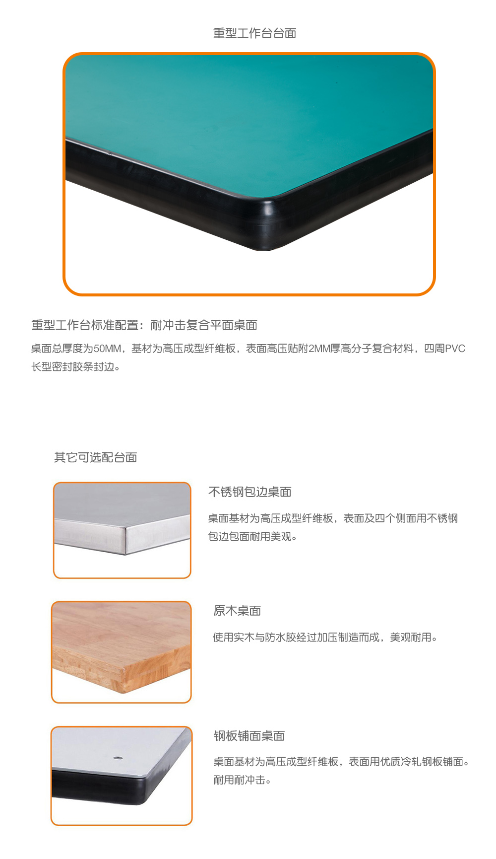 1.首先确认所需外观。重型工作台按外观配置分为9种。2.选择所需桌面种类和桌面尺寸。默认桌面是50厚耐冲击平面桌面。桌面长度有1800长和1500长2种。根据特殊需要可定做桌面表面1MM不锈钢包边包面或者钢板铺面桌面。桌面定制最大尺寸可做到长2400*宽1200MM。3.工作台采用组合式全拆装结构,各部件可根据需要灵活变通组合搭配,1800长工作台最多每台可配置2个工具柜,既桌面下方左右各装1个。4.工作台如果有顶棚板的款式可在顶棚板上装灯。顶棚板安装位置可调。灯架灯管,插座开关,客户自备。工作台桌面往上第1块电源孔背板上有标配6个标准电源开关插座安装孔位。5.工作台台面以上背板上可以选配各种挂钩挂件挂各种工具。工作台价格不含挂钩挂件。